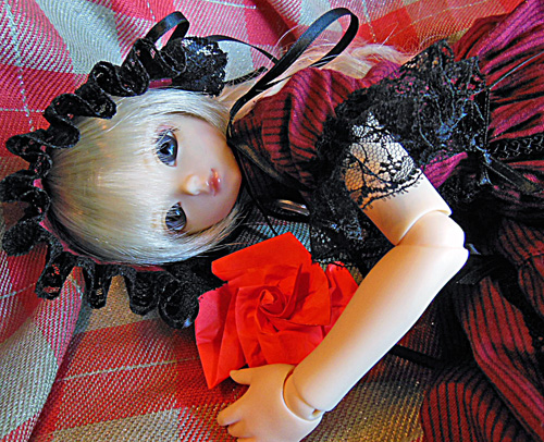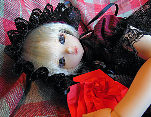 寝転んで撮ってみたエリーゼさん。折り紙のバラ付き。