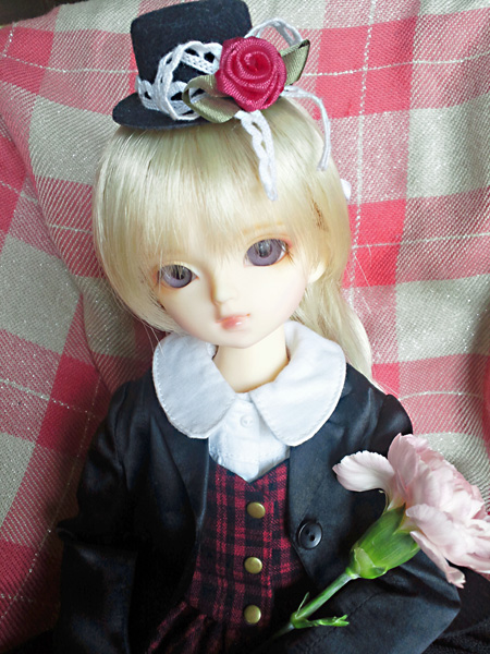 窓のプレオープンでもらった切花(カーネーション?)を持たせてみました。