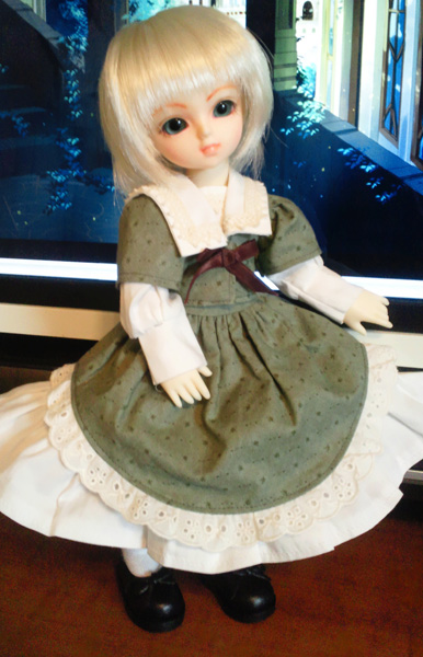 ドレスのスカートは前と後が少しだけ長いのでエプロンみたいです。