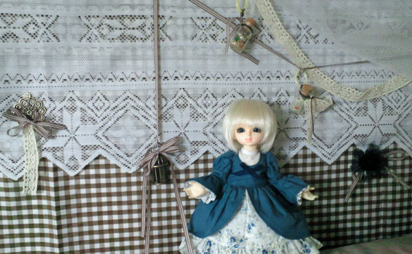 レースとかをいったん、全部取り外して木の壁掛けケースとかを付けました。